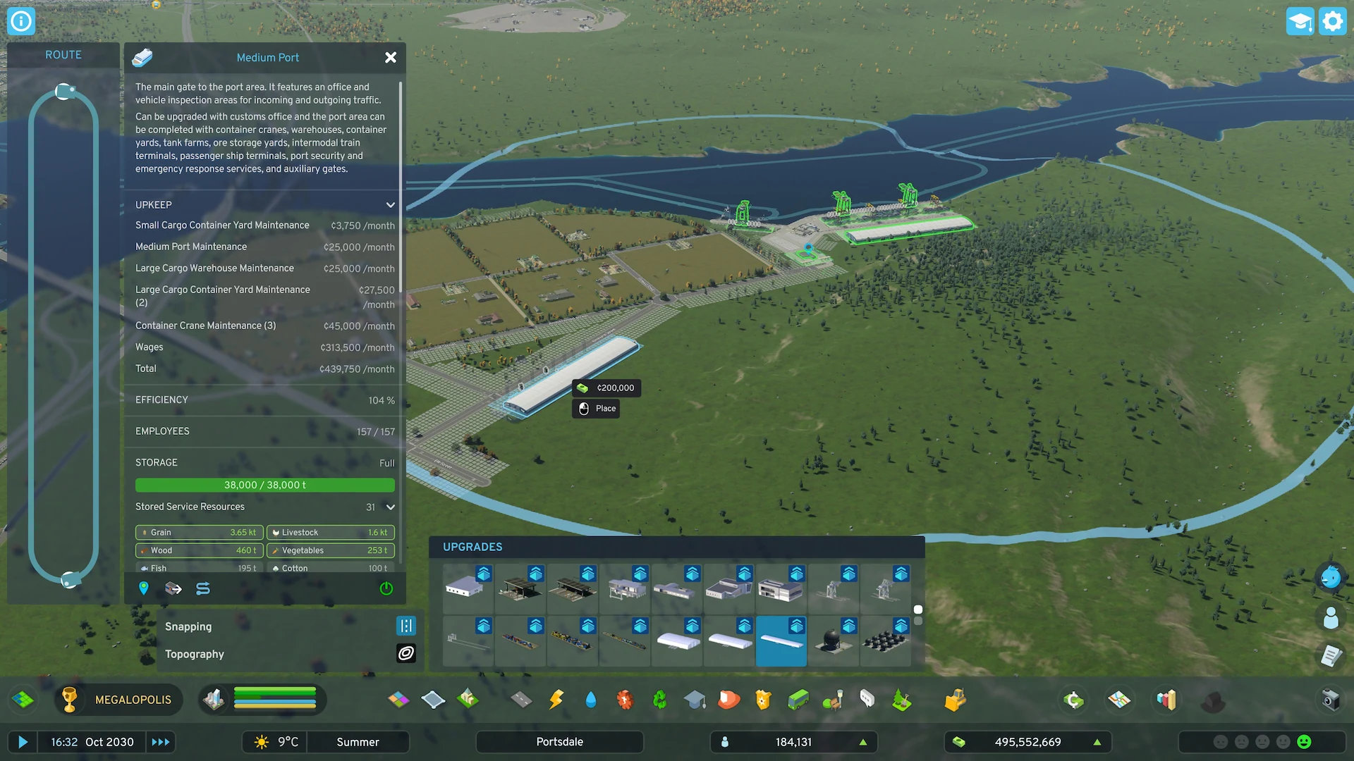 You do not have to follow the steps outlined above exactly in that order. For example, you may want to line the shore with Port Quays, which can also be found in the Water Transportation Menu, if defining the shape of your port is the best starting point for you. Or you might decide to add the storage facilities last instead of immediately after placing your Port gate. You just need to keep in mind that the upgrades must be placed within a 1 km radius of the Port gate.