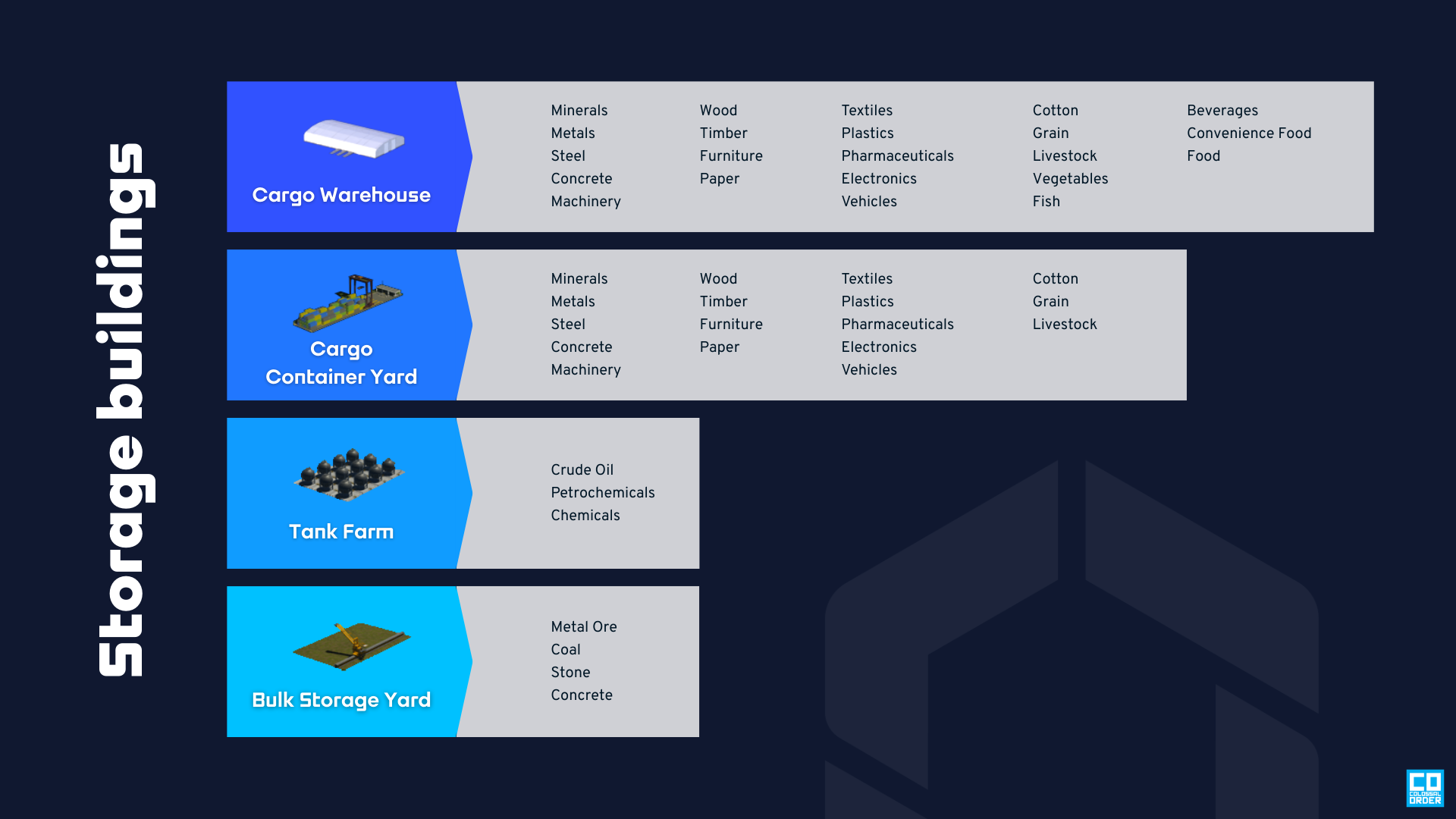 A port needs storage to be functional, and while every storage facility adds to the port’s overall capacity, they are tied to different resources. This enables you to specialize your port with, for example, Tank Farms, which only store oil, petrochemicals, and chemicals, or diversify your harbor with a combination of some or all options. There are four different types of storage facilities: Cargo Warehouses, Cargo Container Yards, Tank Farms, and Bulk Storage Yards, which all come in Small, Medium, and Large sizes.