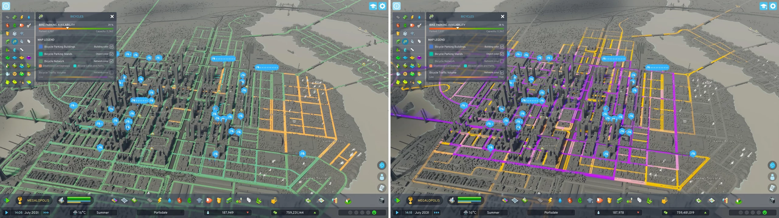 Before we end this dev diary, we want to show you the new Bicycles Info View. Here you can track your bike parking availability to see how many bicycles are currently parked in your city and how many available spots you have. You can also easily spot the parking buildings to see if any areas of your city are lacking bike parking spots, and even switch to other Info Views, such as Education or Public Transportation, to find ideal spots to add more parking.