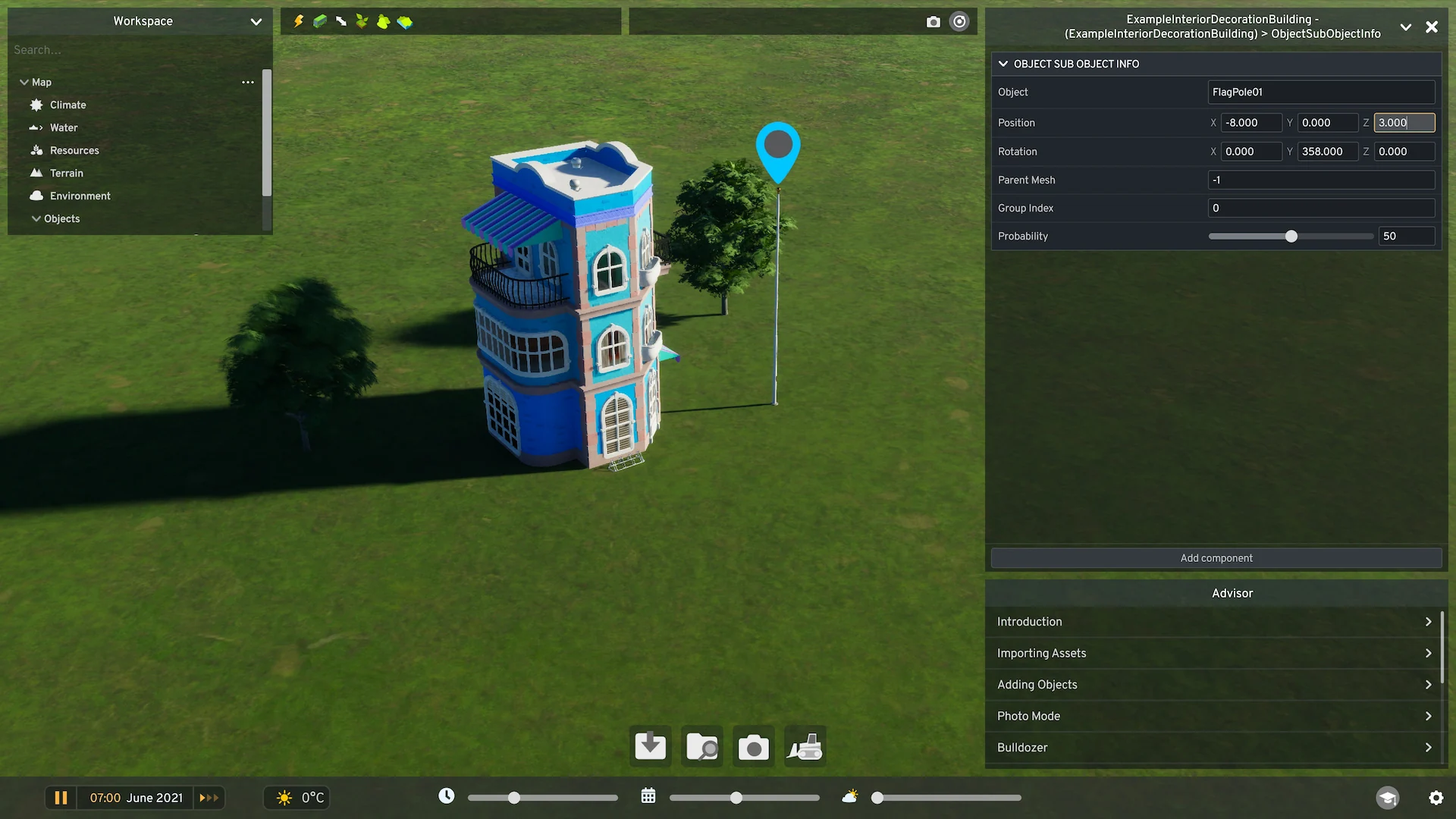 Let’s get into it! From the Main Menu, you open the Editor, just like when you would when creating a custom map. No separate Editor for assets. Instead, you have a scene where one or more objects can be placed and edited simultaneously. That’s right! If you’re making multiple assets, you can prop them all at once! The default scene is an empty green land, but you can also open a map and add roads and trees for size comparison and a visual reference for how your asset will look in the game.