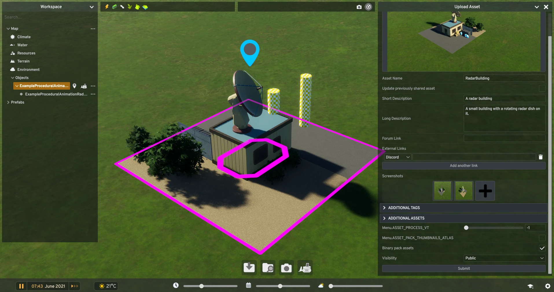 All assets placed in the scene are listed on the Workspace panel on the left of the screen. Here, you can easily locate an asset you’re working on or remove it. Most importantly, this is also where you save your custom asset and, when it’s ready, share it on Paradox Mods so others can enjoy your creation. You can add a description to help others understand what kind of asset you created and include screenshots showing off your work. Once you’re ready to share it, simply press Submit and wait for the serialization and sharing process to finish.